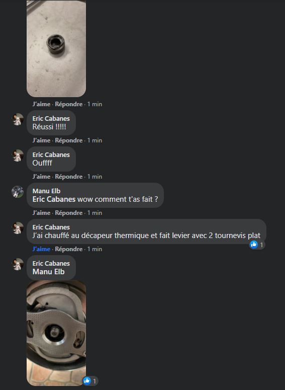 Sur facebook y'a un gars qui demande de l'aide parce qu'il a cassé son tambour d'embrayage comme j'avais dit que ça pouvait arriver. C'est à dire qu'il ne reste qu'un tout petit morceau enclenché sur le vilo, la partie avec le filetage pour l'arrache étant restée sur le tambour... Résultat : démontage impossible ! :shock: