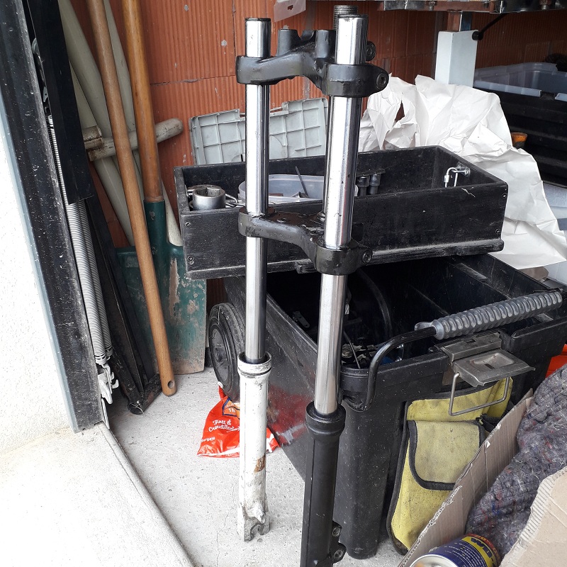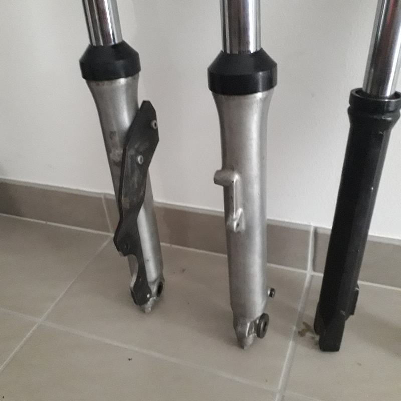 J'ai récupéré cette fourche! Une Paioli, hauteur 720 mm env, la hauteur du tube de potence fait 220 mm, et les fourreaux 27 mm env mais c'est surtout cette pâte qui servirait à monter un étrier qui ne me plait pas. Çà fait pièce rapportée , çà fait pas clean!
