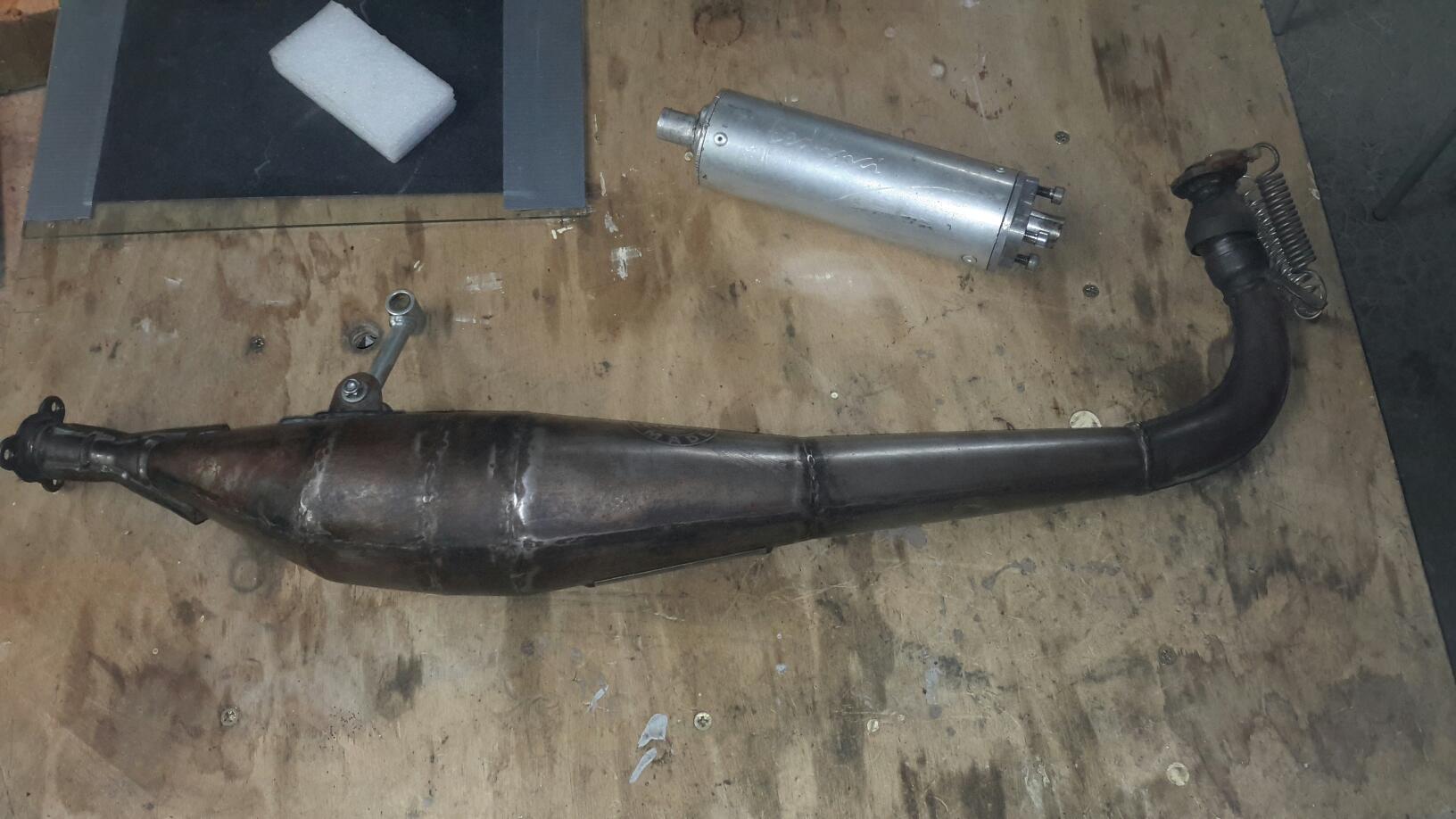 Avec l'assos, on vient de récurer un lot de pièces qui trénais au fond d'un atelier, dans lequel se trouvais ce jolis pot d'échappement qui daterait de la fin des années 90.