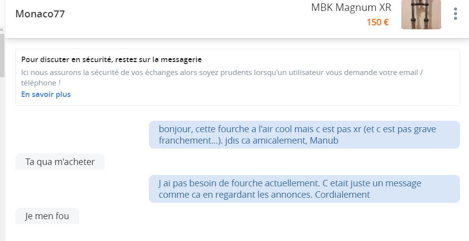 Bah c'est vrai que je l'ai un peu embêté mais bon, en regardant les annonces, j'ai écrit un peu spontanément... Sa fourche était bien et le prix me semblait vraiment très correct, j'ai pas compris pourquoi il avait écrit "Xr". Il n'avait pas juste écrit Xr en mot clé mais tout présenté comme une fourche d'XR. Y'a pas que les Xr dans la vie !