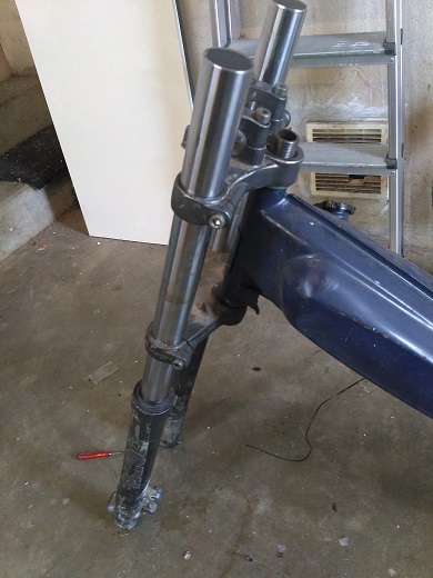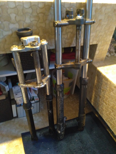 Encore moins simple a trouver, lourd comme une vache, longue et inversé, une fourche de Peugeot XP Avenger