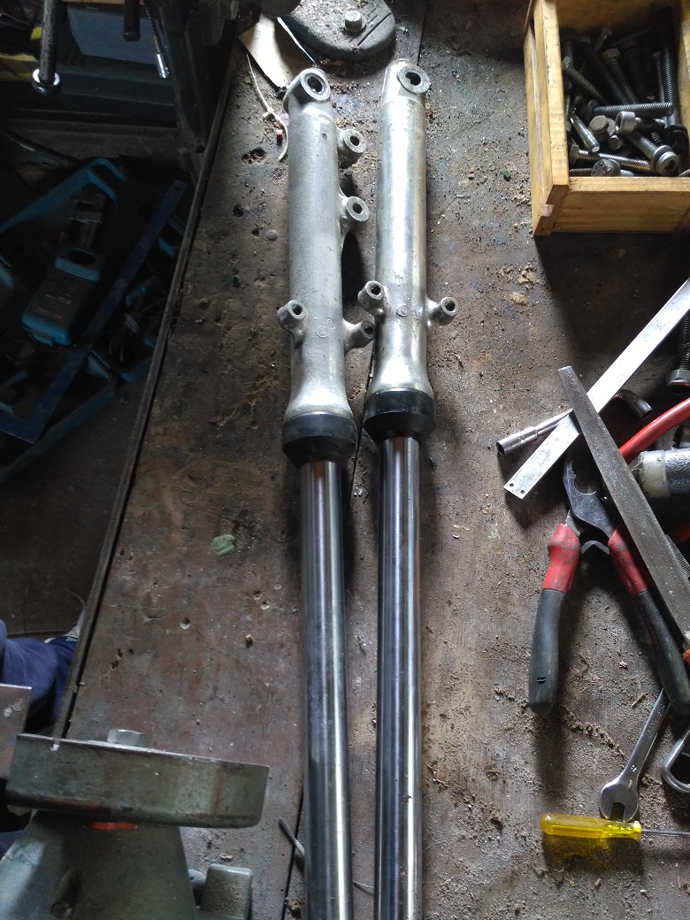 Voila en photo les tubes, ca vous dit qqchose?, je me demande si ca vient pas d'une vieille mob genre mtx 50, y'a les fixations d'étrier de disque et les fourreaux ne sont pas trop long, j'aurais juste à la raccourcir un peu en ressort.