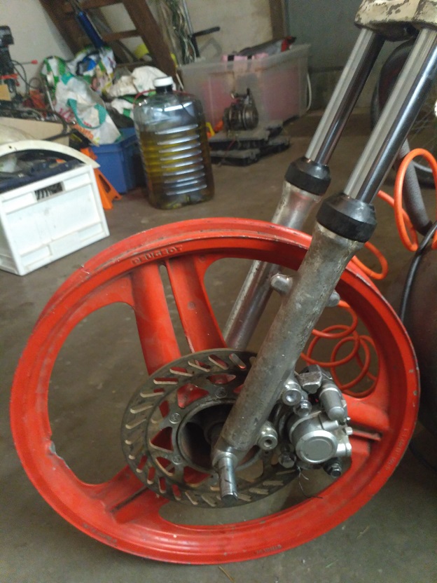 En fait j'ai déjà une roue arriere de mob montée avec un disque 220mm de kx 125 prête à monter sur la nouvelle fourche.