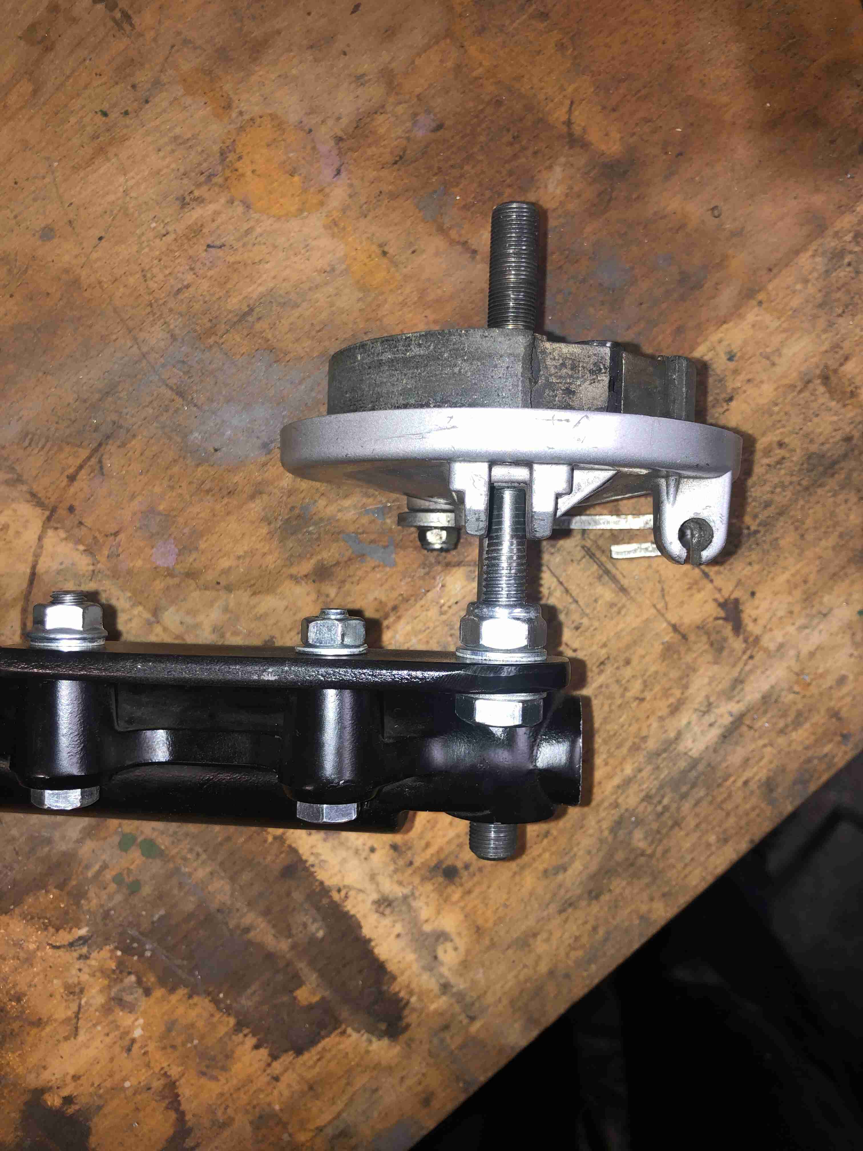 La patte en elle même est en acier 3mm d’épaisseur et le téton est un boulon m10 en 8.8. Il est volontairement trop long pour pouvoir le raccourcir à exactement la bonne taille quand j’aurai l’axe de roue et fait les entretoises.