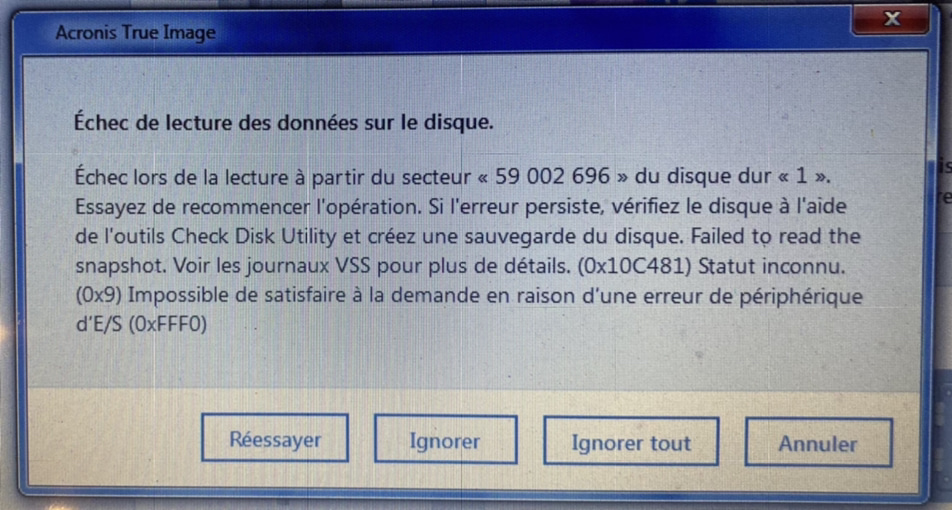 J'ai essayé de couper l'anti-virus, formater le disque cible, checker et réparer le disque source via l'invite de commande (suite macrium qui me dit "erreur 9 read failed")