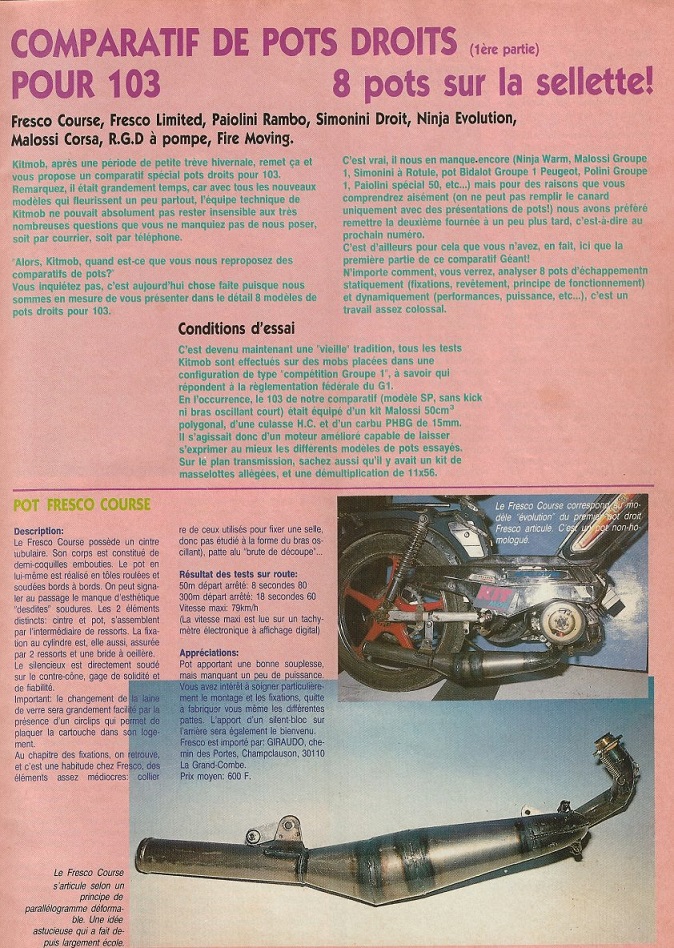 Ce comparatif met par ailleurs en évidence que sur 103 le fresco ne se distingue pas singulièrement des bons pots serpentins. Sur 51, c'est une autre histoire, du fait de l'histoire des coudes trop longs des pots serpentins sur cette machine. Les constructeurs ne faisant que rallonger le coude de pots prévus à la base pour 103. Les pots fresco s'adaptant indifféremment sur les deux machines ne souffrent pas de ce défaut.
