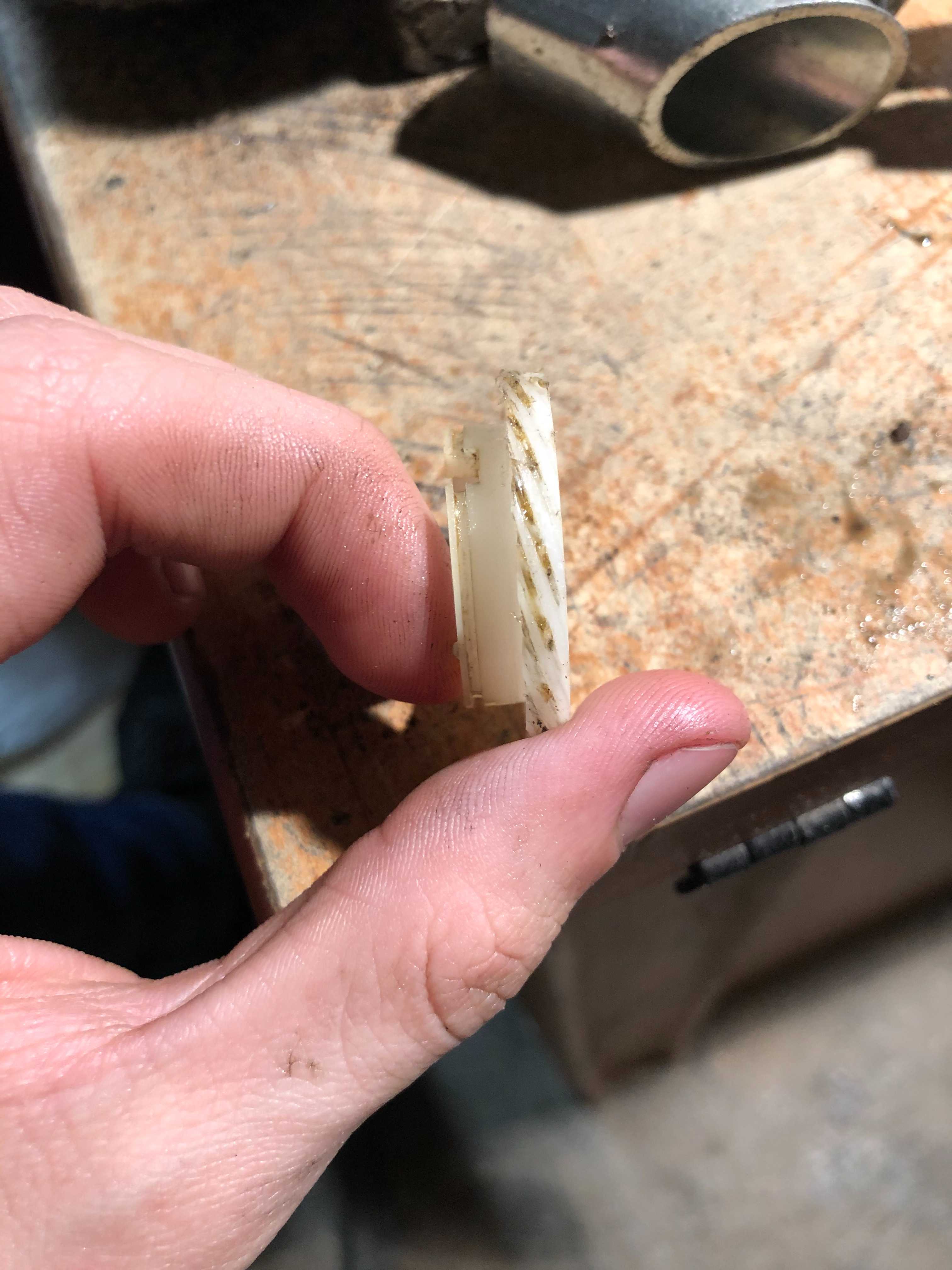 La poisse ! L'engrenage en plastique de l'entraineur est complètement mort, les dents sont usées au point de ne plus entrainer le câble.