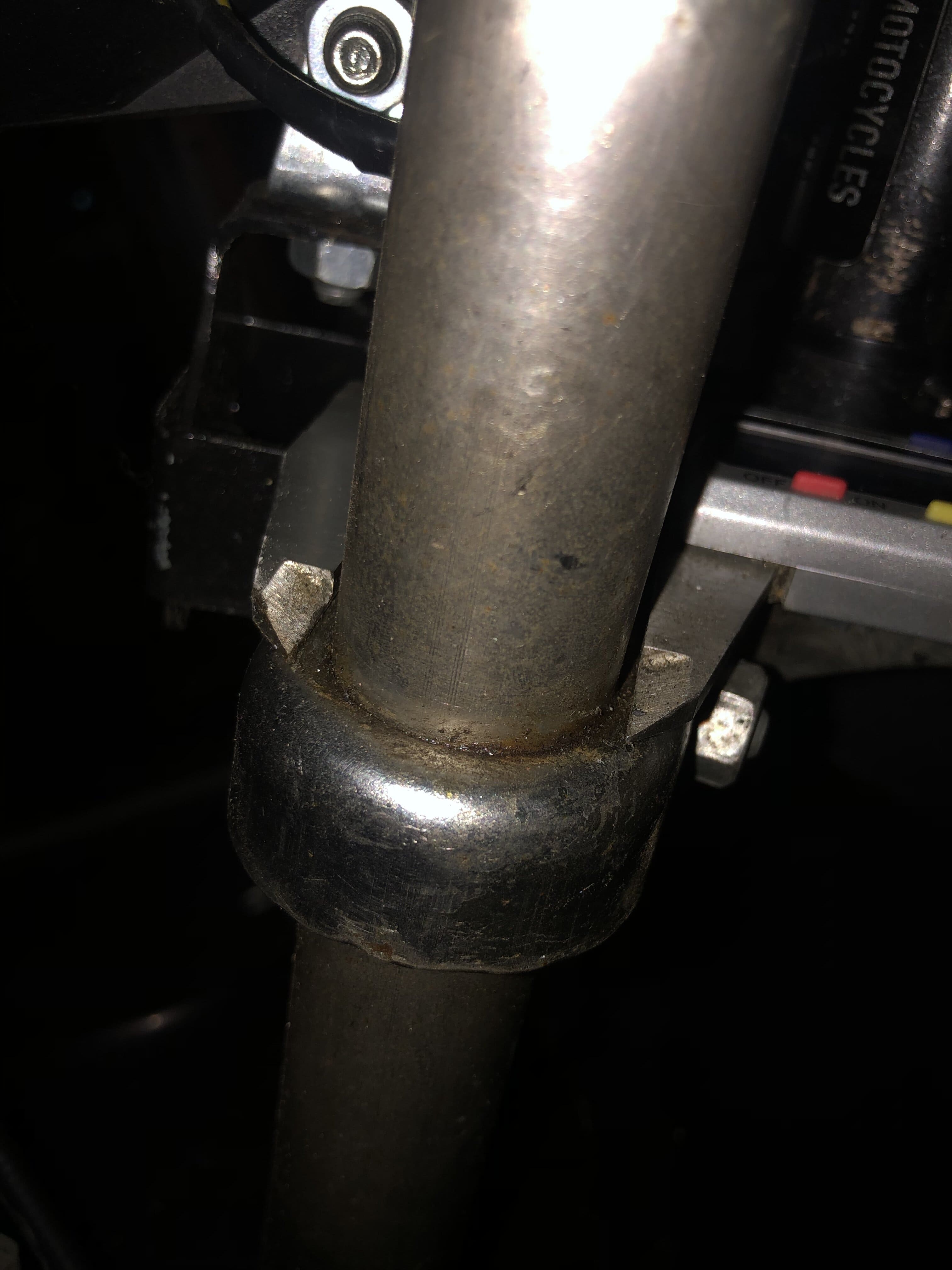 Je me suis jamais lancé dans ce genre de truc mais tu pourrais pas souder une bague diamètre intérieur 32 sur le haut du té inférieur ? Pour le renforcer et avoir un meilleur guidage. Et éventuellement fendre cette bague pour rajouter une vis de serrage ?