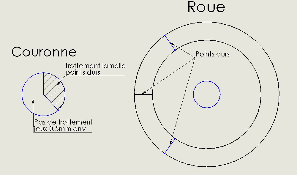 Sur plus de la moitié de la couronne, la lamelle ne touche pas la couronne (jeux de 0.5mm env) et sur le reste de la couronne la lamelle touche. Les points durs se produisent lorsque la couronne frotte sur la lamelle, zone hachurée sur le dessin ci-joint.